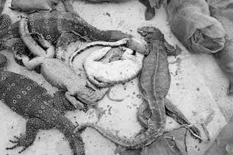 5776只奄奄一息的巨蜥被裝在一個(gè)個(gè)藍(lán)色和黃色的編織袋中,260只馬來(lái)西亞閉殼龜和370只亞洲巨龜被牢牢地封在木箱中,而1170條眼鏡蛇也失去了昔日的兇狠,萎靡不振地蜷縮在白色塑料箱中……