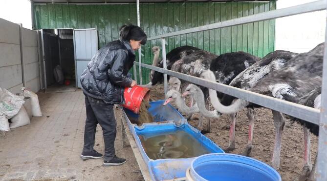 走進(jìn)嘉會鎮(zhèn)孔雀鴕鳥園,圍欄里一只只體型健壯、毛色光亮的鴕鳥在圈舍內(nèi)邁著“大長腿”閑庭信步,瞪著一雙大眼睛好奇地看著周圍的環(huán)境和到訪的客人。孔雀鴕鳥園負(fù)責(zé)人宋文燕正忙著攪拌飼料,給鴕鳥準(zhǔn)備“午餐”。