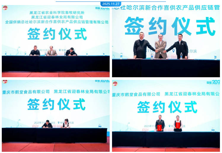 開幕式后舉行了簽約儀式。黑龍江省農(nóng)業(yè)科學(xué)院畜牧研究所、哈爾濱新合作喜供農(nóng)產(chǎn)品供應(yīng)鏈管理有限公司與黑龍江省迎春林業(yè)局達(dá)成合作;重慶市鵝堂食品有限公司也與黑龍江省迎春林業(yè)局有限公司完成簽約,展現(xiàn)了強(qiáng)強(qiáng)聯(lián)合、深化產(chǎn)業(yè)協(xié)作的趨勢。